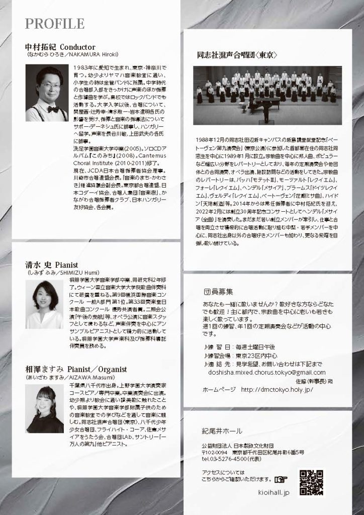 こちらでは同志社混声合唱団<東京>2024コンサートをより楽しんでいただくために、出演者(団員)によるワンポイントの曲紹介を行っています!